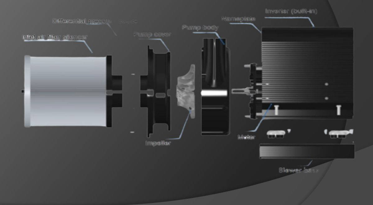 - Higher efficiency (up to 85%): Under the same energy consumption and pressure, the flow of Explorer super blower is more than 30% than the similar energy-saving high speed centrifugal blower.